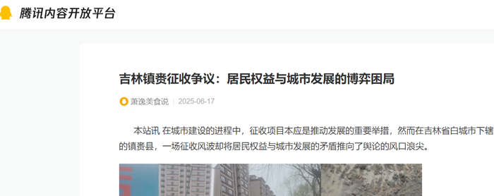 2025 年 5 月9日,多家媒体曾经以《吉林镇赉县征收项目引争议,居民权益与发展矛盾待解》为题,报道了镇赉县一征收项目引发争议事件。爱心洗车场老板张启东反映,镇赉县住建局与开发商镇赉县佳鑫房地产开发有限公司在项目推进中存在诸多违规行为。该项目在未完成净地的情况下就进行招、拍、挂流程,涉事楼盘与周边民房楼间距过近,基础挖槽距离民宅仅 3 米多,严重影响居民生活并带来安全隐患。同时,征收补偿方面,征收方补偿方式简单,对张启东洗车店营业执照年限认定存在争议,且缺乏主动协商机制,在未达成协议时开发商擅自施工,张启东多次反映问题均未得到有效解决,警方介入后也未实质性化解矛盾,使得争议不断升级。
