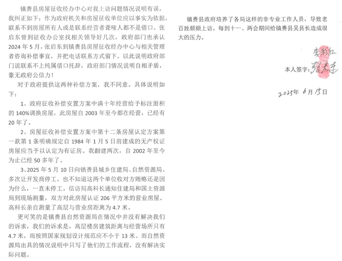 然而,被拆迁人张启东对政府部门的回应提出了强烈质疑。张启东指出镇赉县房屋征收经办中心称联系不到他是借口,自己曾多次前往征收办公室并留下联系方式,政府部门的情况说明自相矛盾,缺乏公信力。对于补偿方案,他认为自家房屋经营已满20 年,应按规定获得标注面积140%调换房屋的补偿;房屋自2002 年翻建至今已50 多年,应认定为有证房。此外,他强调双方现场测量高层与营业房距离为4.7米,远小于按国家规划设计规范应有的13米,而自然资源局的情况说明未解决这一实际问题。在他看来,政府部门工作人员专业能力不足,导致问题频出,百姓频频上访,不仅损害了居民权益,也给地方带来诸多不稳定因素。