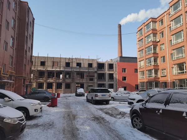 走进跃进家园小区大门口,就能看见该小区两排4栋商品楼住宅区,对面约500米就是一栋南北走向的连体楼,北面那栋原是小区供暖的锅炉房,现在改建三层待售的商品楼房,南侧原是一栋三层物业办公楼,物业办公楼现在外墙保温苯板已经去掉,墙体外围搭起纵横缴存的脚手架,楼内已经隔成若干居室空间,从80平米到120平米不等。然而,最令居民不解的是,原来的锅炉房和物业办公楼中间曾是断开的,中间间距约18米,2020年10月份,承包经营供暖和小区物业的李柏辉将小区锅炉房与物业办公楼中间夹楔地段建起了一栋三层楼房,跃进家园小区居民管这个中间夹楔违建起的楼叫做“楔子楼”。