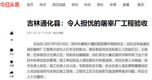 本站讯 2021年5月18日,深圳市赛格大厦的摇晃事件刚刚发生,远在吉林省通化县的屠宰厂工程再次成为人们关注的焦点。曾经是该项目实际施工人的赵红石、王国新,在举报多次无果之后,找到本站编辑部,他们举出大量证据并详细列举了这个项目中标单位放弃管理,施工单位的法人授权委托书弄虚造假,项目负责人马晓斌、技术负责人张东、施工负责人任小凤、专职质检员文雅、安全负责人漆应德等重要岗位人员自始至终均未到过施工现场,工程完工后又在验收方面造假等诸多问题,听后令人十分震惊。