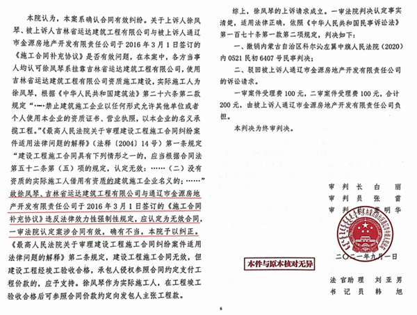 徐凤琴上诉后,通辽中院经过开庭审理,在先后做出(2019)内05民初20号民事判决书、(2019)内民终605号民事裁定书后,2021年9月1日,又做出(2021)内05民终2190号民事判决书,依据双方签订的合同和相关法规,判决认定案涉工程造价按照每平米1700元计算单价,再次坚决次纠正了科左中旗法院关于吉地华府工程承包单价的违法判决!做出这一公正判决法官的名字是审判长白丽、审判员张雷、董明华,这一公正判决,为徐凤琴直接挽回损失800万元!