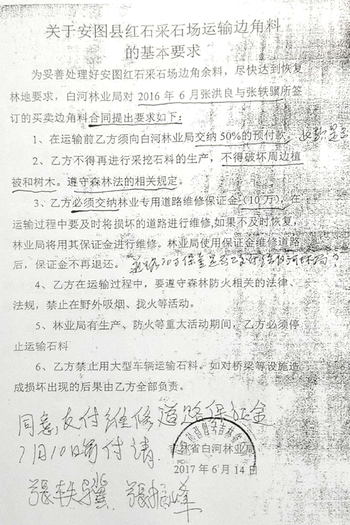《关于安图县红石采石场运输边角料的基本要求》中,白河林业局与张振峰、张轶骥约定:“为处理好采石场(即红石采石场)的边角料(即白河林业局与莱州石材厂开采、加工石料后形成的花岗岩边角料),尽快的恢复林地要求,白河林业局对2016年6月张轶骥与张洪良签订的买卖边角料的合同提出如下要求: