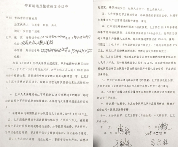 1、白河林业局与张波签订的《协议书》,一审判决认为是依照和龙林区基层法院(2016)吉7502行初1号行政判决的要求,进行林地恢复和碎石清理。一审判决对这一事实的认定是颠倒黑白,该《协议书》的签订的事实是:张波向白河林业局的某副局长有着说不明白的关系,正是这位副局长和于某某以白河林业局的名义与张波签订的此《协议书》。