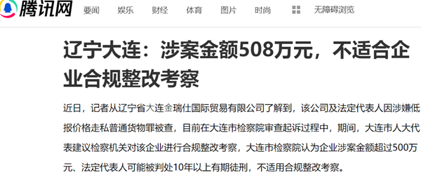 近日,记者从辽宁省⼤连⾦瑞仕国际贸易有限公司了解到,该公司及法定代表人因涉嫌低报价格走私普通货物罪被查,目前在大连市检察院审查起诉过程中,期间,大连市人大代表建议检察机关对该企业进行合规整改考察,大连市检察院认为企业涉案金额超过500万元、法定代表人可能被判处10年以上有期徒刑,不适用合规整改考察。