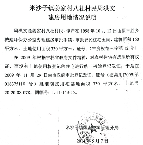 米沙子镇国土资源管理分局出具的《建房用地情况说明》证明:“周洪文是姜家村八社村民,该户在1998年10月12日由原三胜乡城建环保办公室办理建房审批手续,审批农民住宅五间,建筑面积160平方米,土地使用面积330平方米。证号:(吉房权德三字第12号)。在2009年根据吉林省政府文件精神,对农村住宅有房屋所有权证,而没有土地使用权登记的住宅进行统一初始登记发证,于是在2009年11月29日由市政府审批登记发证,证号(德集用[2009]第018375110号)批准划拨用宅基地面积330平方米,土地号20-20-08-078,图幅号:L-51-143-55。”