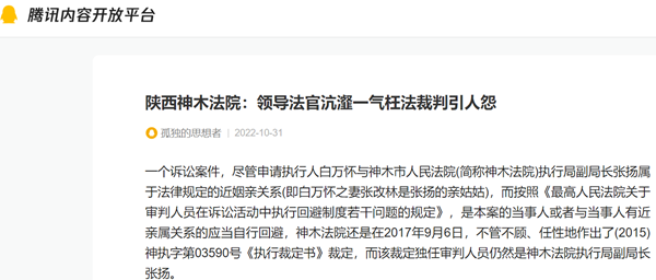 一个诉讼案件,尽管申请执行人白万怀与神木市人民法院(简称神木法院)执行局副局长张扬属于法律规定的近姻亲关系(即白万怀之妻张改林是张扬的亲姑姑),而按照《最高人民法院关于审判人员在诉讼活动中执行回避制度若干问题的规定》,是本案的当事人或者与当事人有近亲属关系的应当自行回避,神木法院还是在2017年9月6日,不管不顾、任性地作出了(2015)神执字第03590号《执行裁定书》裁定,而该裁定独任审判人员仍然是神木法院执行局副局长张扬。