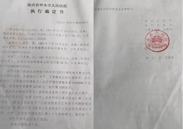 同时,案件当事人认为(2015)神执字第03590号《执行裁定书》裁定的审判人员张扬应当回避而没有回避,严重违反法定程序,该裁定查封的川龙大酒店及所在土地、店内附属物及所有财产并非被执行人宋平和王翠娥的个人财产,川龙大酒店不是本案的被执行人,(2015)神执字第03590号《执行裁定书》应依法予以撤销。他们并多次向神木法院提出再审申请,且提供了4份法院整体回避裁判案例的情况说明,但是,他们的申请仍多次被神木法院无情拒绝,当事人主张的自身利益的合法权利受到损害。
