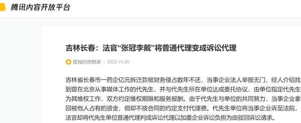 吉林省长春市一药企亿元拆迁款被财务侵占数年不还,当事企业法人举报无门,经人介绍找到曾在北京从事媒体工作的代先生,并与代先生所在单位达成委托协议,由单位指定代先生为其维权工作,双方约定维权期限和服务报酬。由于代先生与单位的共同努力,当事企业拿回被他人占有的资金,但却不按合同的约定支付代理费。代先生单位将当事企业诉至法院,法官却将代先生单位普通代理判成诉讼代理以加重企业诉讼负担为由驳回诉讼请求。