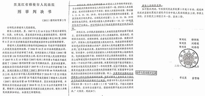 2011年1月19日,穆棱市法院作出(2011)穆刑初字第2号“无罪”判决。法定时限内检察院未抗诉,(2011)穆刑初字第2号刑事判决书已经发生法律效力。