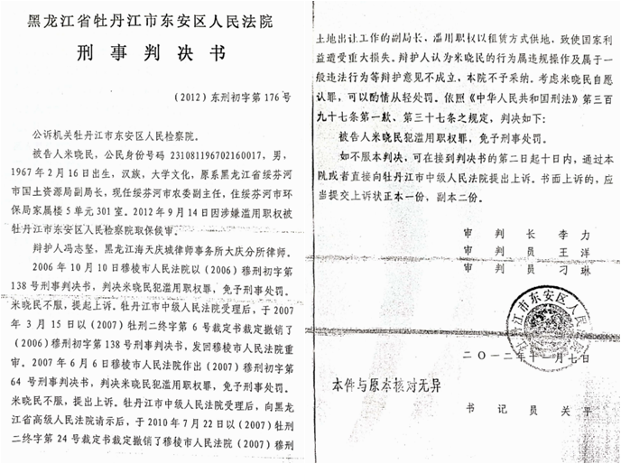 2012年11月7日,东安区法院如出一辙,作出(2012)东刑初字第176号刑事判决书,再次判决米晓民犯滥用职权罪,免于刑事处罚。该判决书称:“米晓民作为主管土地出让工作的副局长,滥用职权,以租赁方式供地,致使国家利益遭受重大损失。”