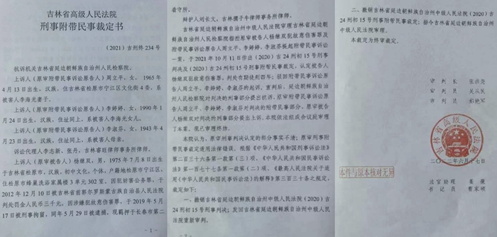 在被害人家属不断上访下,延边州检察院就此案提起抗诉。媒体曝光后,吉林省高级人民法院终于开庭审理了此案,并下达了(2021)吉刑终234号刑事附带民事裁定书,该裁定书称:本院认为,原审刑事判决认定的部分事实不清;原审刑事附带民事裁定适用法律错误。根据《中华人民共和国刑事诉讼法》第二百三十六条第一款第(三)项、《中华人民共和国民事诉讼法》第一百七十七条第一款第(二)项、《最高人民法院关于适用《中华人民共和国民事诉讼法>的解释》第三百三十条之规定,裁定如下: