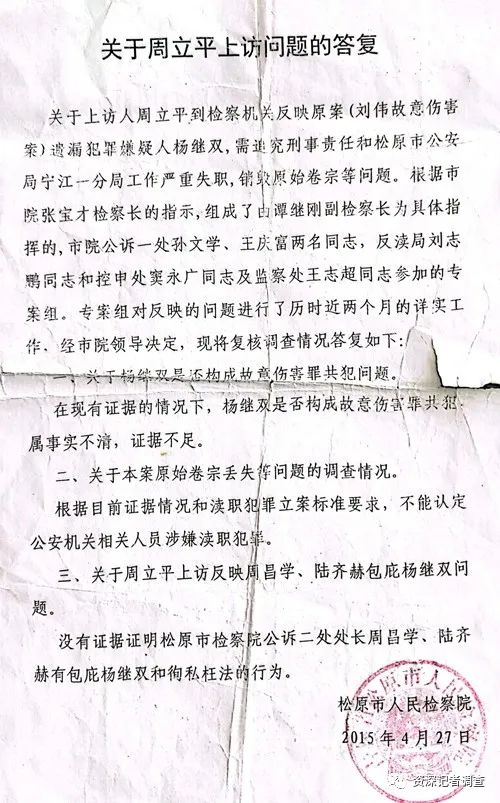 “关于上访人周立平到检察机关反映原案(刘伟故意伤害案)遗漏犯罪嫌疑人杨继双,需追究刑事责任和松原市公安局宁江一分局工作严重失职,销毁原始卷宗等问题。根据松原市检察院张宝才检察长的指示,组成了由谭继刚副检察长为具体指挥的,市检察院公诉一处孙文学、王庆富两名同志,反渎局刘志鹏同志和控申处窦永广同志及监察处王志超同志参加的专案组。专案组对反映的问题进行了历时近两个月的详实工作,经市检察院领导决定,现将复核调查情况答复如下: