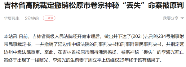 本站讯 日前,吉林省高级人民法院经开庭审理后,做出并下达了(2021)吉刑终234号刑事附带民事裁定书,一并撤销了延边州中级法院的刑事判决书和刑事附带民事判决书,并指定延边州中级法院重审。至此,在吉林省松原市闹得沸沸扬扬、卷宗神秘“丢失”的李海光死亡案终于出现了一缕曙光,李海光的生前妻子周立平上访维权29年终于该有结果了。