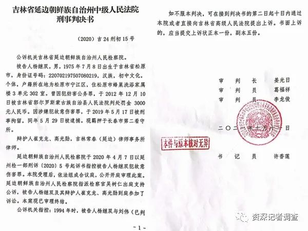 延边州中级法院依据后补的卷宗,经异地审理,做出(2020)吉24刑初15号刑事判决书,以故意伤害罪判处杨继双有期徒刑四年。延边州的刑事判决书对杨继双的犯罪事实是这样认定的: