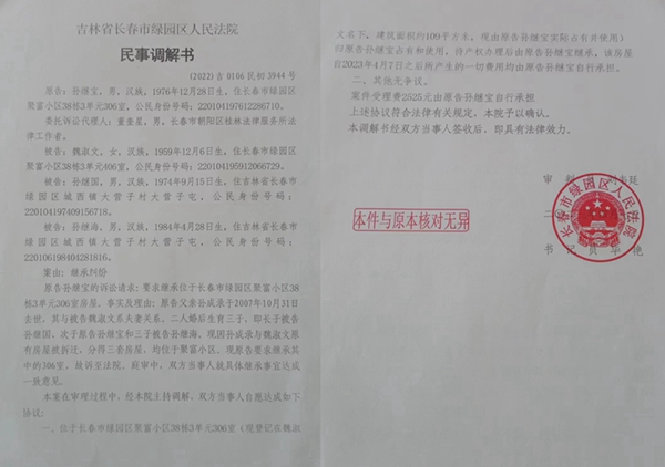 据孙继宝夫妇介绍,孙继宝因继承官司曾经到绿园区法院起诉,该院受理后其下辖的合心法庭组织双方进行了调解,并于2023年4月7日达成民事调解书(【2022】吉0106民初3944号),双方当事人自愿达成如下协议:位于长春市绿园区聚富小区38栋3单元306室(现登记在魏淑文名下、建筑面积约109平方米,现由原告孙继宝实际占有并使用)归原告孙继宝占有和使用,待产权办理后由原告孙继宝继承,该房屋自2023年4月7日之后所产生的一切费用均由原告孙继宝自行承担。二、其他无争议。案件受理费2525元由原告孙继宝自行承担。但因拆迁父亲孙某某得到的130万元补偿款并未分割,孙继宝遂再次起诉要求法院调取银行流水,并对这部分财产在三兄弟间进行分割。刘韦廷法官则认为,上次达成调解协议时,孙继宝已经放弃了对130万元存款的分割权,但孙继宝夫妇认为其放弃的是案涉的13万元其他费用,调解达成的协议中并没有其放弃130万元补偿款继承权的内容。于是,25日上午,孙继宝夫妇一进到刘韦廷法官的办公室,双方就此事就发生了争执。孙继宝夫妇提供的录音文件显示:孙继宝进到刘韦廷办公室后就说130万元并没有分割,法官刘韦廷则坚持说孙已经放弃,孙继宝的妻子周海霞见状就上前和法官理论,并说:“我们多次要求你调取银行流水,你都不给调。”刘则命令周“别给我说这些了”,“你要这样说,你就给我出去”。周问:“干啥让我出去?”刘称:“你不是我的当事人,我当然不接待你了!”录音中随机有推搡的声音,周海霞则喊:“你打我干啥呀,现在报警!”一阵杂乱的声音后,法院一名女法官对周进行了解释和安慰......