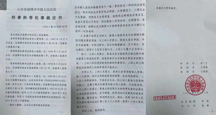 另据判决书中景士永的辩护律师所述:1.法院认定肖爱云、景涣文,实施击打张敦茂肋骨部位等故意伤害行为,造成其肋骨骨折,事实不清,证据不足。2.案发当日,张店区医院 CT 片诊断报告示,张敦茂仅左侧第 6 肋骨骨折,其左侧第 7-9肋骨骨折是事后近一个月的时间里发生的骨折,与二人行为无因果关系,不排除其他原因造成。3.本案系因张敦茂寻衅滋事引发,肖爱云、景涣文系正当防卫。肖爱云无伤害的直接故意。但对这些辩护词,两级法院均不予采信,只认定张敦茂等打人者的说辞。