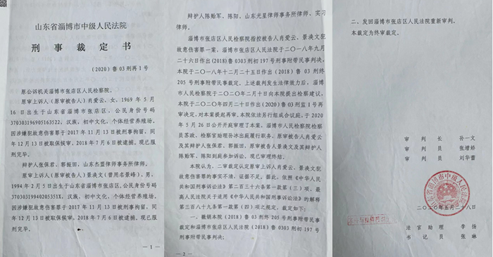 景士永上诉至淄博市中院,中院没做任何调查了解就维持了原判。景士永申诉至淄博市检察院,检察院于2020年2月10日向淄博市中院提出检察建议。中院于2020年4月20日再审,并另行组成合议庭于2020年 5月 28 日裁定,认定原审上诉人肖爱云、景涣文犯故意伤害罪的事实不清,证据不足,裁定撤销本院(2018)鲁 03 刑终 205 号刑事附带民事裁定和淄博市张店区人民法院(2018)鲁 0303 刑初 197号刑事附带民事判决,发回原审法院重新审判。张店区法院在没有任何新证据的情况下,于2020年12月28日作出(2020)鲁 0303 刑初 479 号刑事附带民事判决,除对景涣文免除刑罚以外,维持原判。肖爱云、景涣文不服,提出上诉。中院受理后经过不开庭审理维持原判。目前,景士永对该判决不服,已经上诉到山东省高院,高院已经立案等待宣判。