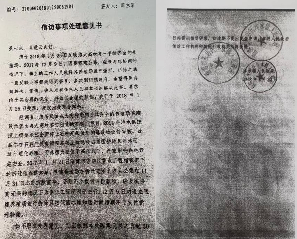 随后,景士永按照程序逐级上访,先后到市、省信访局反映情况,省信访局给了景士永一份沣水镇镇政府回复给省信访局的处理意见书的复印件。处理意见书的内容是:“养殖场在石料厂原有面积基础上肆意侵占园林耕地,且对地面进行硬化养殖。而养殖大棚位于高压线下,严重影响供电设施安全。因没有按照拆迁时间拆迁不予补偿。”景士永说:“养殖场的用地有土地承包协议,有立项审批手续,并非肆意侵占园林耕地。高压线是在养殖场建成之后架设的,难道供电局不懂得供电设施安全不安全吗?这完全是为了不给补偿款而捏造的莫须有罪名!”沣水镇副书记王韶华公开对景士永说:“我就不相信拾掇不了你!”他身边的工作人员康康对景士永说:“你就是上访到北京、上海,不管哪里,你回来我就是不给你处理,看你能咋的!”