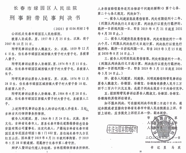据相关法律文书记载,此次恶性事件发生十三年后,长春市绿园区法院终于在2020年9月21日作出2020吉0106刑初2号、3号刑事附带民事判决书。该判决书称: