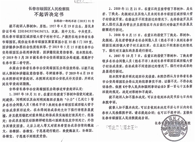 本站讯 17年前的2007年10月31日,吉林省长春市绿园区城西镇大营子村发生一起因强拆造成的死亡事件。事发后,几名直接参与打人的凶手已经被追究刑事责任,但是被害人家人们认为的“幕后主使”至今仍未被追究刑事责任。2024年2月2日,最高人民检察院作出《刑事申诉结果通知书》(高检刑申通【2024】211号)后,被害人孙成录的二儿子孙继宝找到媒体称:由于层层保护,此案的“幕后主使”董江、郭树和至今仍未被追究刑事责任,我们强烈要求追究董江、郭树和的刑事责任。