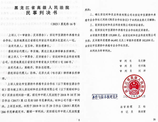 见到记者时,高晓丹说:回忆全部事件发生的经过,不难发现,宝源合作社因资金紧张无力继续建设从而取得国家扶持资金,欺骗我们签订《购买合作社协议》,假意将合作社交给我,待我们进行大量投资建设并获得国家扶持资金后,将我们一脚踢出合作社,并栽赃我方违约,无偿占有我们的大量投资成果,其手段何其卑劣!在此案中,时和公司已经按时足额支付转让款,宝源合作社应为时和公司办理股权变更登记。宝源公司非法强行抢回牧场,已经构成违约,并应承担相应违约和赔偿责任。但是黑龙江省高院却无中生有认定时和公司违约,判决时和公司不应给付已经收取的转让款,不应支付违约金和损失,是有失公平的,也是不符合《民法典》第五百六十六条的规定的。16号判决对于我来说是省高院人为制造的一起错案、假案和冤案。我有充分的理由怀疑法官是收受了对方当事人的贿赂,或着是受到了个别领导的非法干预,才敢冒着犯罪的风险枉法裁判。为维护自身合法权益,我已经就黑龙江省高院个别法官涉嫌枉法判决问题向上级纪检监察部门进行了实名举报,同时向最高院巡回法庭提出了再审申请,我们将誓死捍卫自身的合法权益,誓死捍卫法律的公正和尊严!