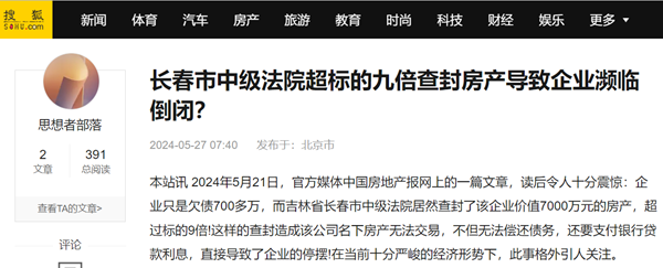 本站讯 2024年5月21日,官方媒体中国房地产报网上的一篇文章,读后令人十分震惊:企业只是欠债700多万,而吉林省长春市中级法院居然查封了该企业价值7000万元的房产,超过标的9倍!这样的查封造成该公司名下房产无法交易,不但无法偿还债务,还要支付银行贷款利息,直接导致了企业的停摆!在当前十分严峻的经济形势下,此事格外引人关注。