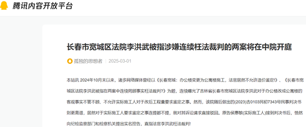 本站讯 2024年10月末以来,诸多网络媒体曾经以《长春宽城:办公楼变更为公寓楼施工,法官居然不允许造价鉴定!》、《长春市宽城区法院李洪武被指在两案中连续罔顾事实枉法裁判?》为题,连续曝光了吉林省长春市宽城区法院李洪武对于办公楼改成公寓楼的客观事实不管不顾、不允许实际施工人对于改后工程量要求鉴定之事。然而,该院随后做出的(2023)吉0103民初7343号民事判决书则更离谱,居然对于实际施工人要求鉴定之事连提都不提,就对其诉讼请求直接驳回。原告侯惠敏(实际施工人)接到判决书后,愤然向纪检监察部门和检察机关提出实名控告,直指法官李洪武枉法裁判!