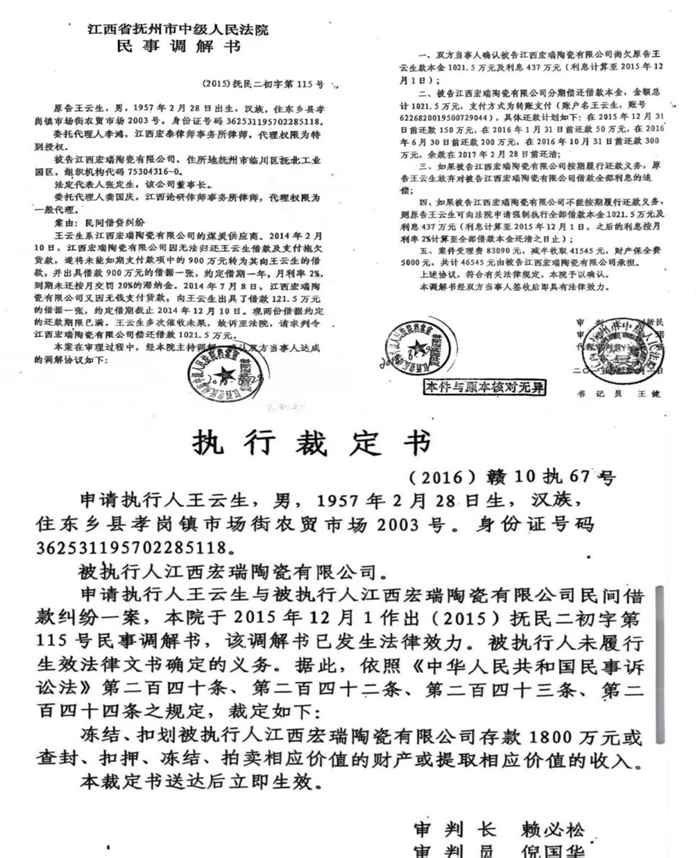 经案件梳理发现,“王云生诉江西宏瑞陶瓷有限公司民间借贷纠纷一案”,抚州市中级法院于2015 年12月1日作出了(2015)抚民二初字第115 号民事调解书,确认双方达成的调解协议如下:一、双方当事人确认被告江西宏瑞陶瓷有限公司尚欠原告王云生本金 1021.5 万元及利息 437 万元(利息计算至 2015 年12 月 1 日);二、被告江西宏瑞陶瓷有限公司分期偿还借款本金,金额总计 1021.5 万元,支付方式为转账支付(账户名王云生,账号6226820019500729044),具体还罴苹缦拢涸� 2015 年12 月 31 日前还款 150 万元,在 2016 年 1 月 31 日前还款 50 万元,在 2016 年 6 月 30 日前还款 200 万元,在 2016 年 10 月 31日前还款 300 万元,余款在 2017 年 2 月 28 日前还清;三、如果被告江西宏瑞陶瓷有限公司按期履行还款义务,原告王云生放弃对被告江西宏瑞陶瓷有限公司借款全部利息的追偿;四、如果被告江西宏瑞陶瓷有限公司不能按期履行还款义务,则原告王云生可向法院申请强制执行全部借款本金1021.5万元及利息 437 万元(利息计算至 2015 年 12 月 1 日,之后的利息按月利率2%计算至全部借款本金还清之日止)……