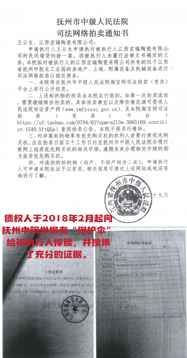 债权人曾经在举报材料中指出,原抚州市中级法院纪检副书记余某某在“宏瑞陶瓷公司”充当违法犯罪的“保护伞”和规避打击的设计师。该公司给余某某配有专门办公室,每月发6000元工资,有工资表签字为证。