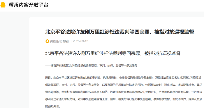 近日,北京市平谷区法院许友刚(此案的审判长、执行局局长、负责监督的现任政治部主任)、万里红法官被实名举报涉嫌为孙艳红提供造假取证、审判、执行、监督等一条龙服务,以及涉嫌的四项重大违法违纪行为,包括枉法裁判、程序违法、违法现场勘察、破坏营商环境等,举报材料直指其利用职权与当事人勾结,涉嫌打击侵害参与北京建设的外地企业,严重破坏北京的营商环境,并涉嫌转移混淆违法违纪举报材料,对抗中央巡视组监督工作。目前,相关材料已提交中央巡视组,事件持续发酵,引发法律界、媒体及公众的强烈关注。