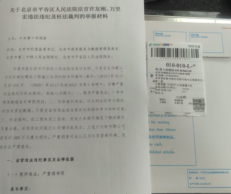 伟鹏公司于8月9日向平谷法院院长及中央巡视组邮寄举报法官许友刚、万里红违法违纪的材料。8月14日,法院工作人员来电,却告知“案件已经申诉,需要走抗诉程序”。当被质问“这是举报法官,不是案件申诉,你能代表院长吗?”并要求书面回复时,对方回答“不能代表院长”,随即挂断电话。