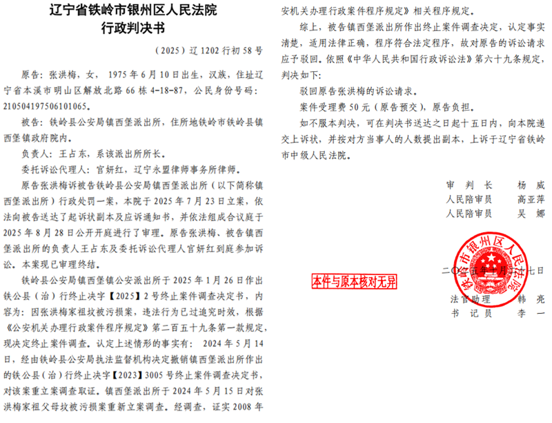 面对这一明显违背生效判决的行政行为,张洪梅一家再次提起诉讼,然而此次的司法结论却来了个180度大转弯。铁岭市银州区法院杨威法官审理后,居然做出(2025)辽1202行初58号民事判决书,判定派出所第二次作出的终止调查决定合法有效,派出所胜诉。