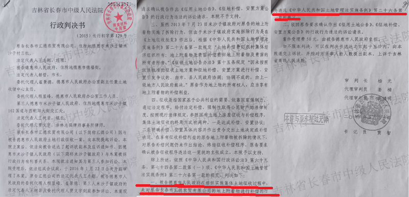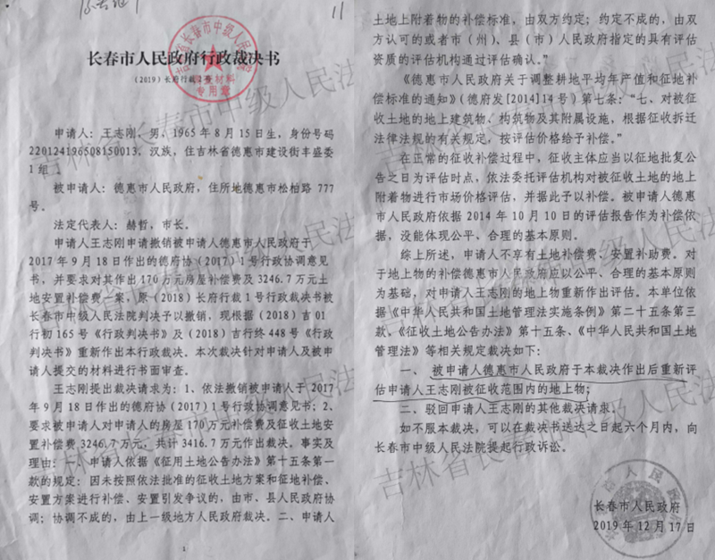 长春中院(2014)长民一终392号民事判决,确认王志刚与米沙子镇政府签订的投资协议书合法有效;该院(2015)长行初字129号行政判决,直接认定德惠市政府拆除农贸市场的行为违法。吉林省高级法院(2016)吉行终550号行政裁定书、长春中院(2017)吉01初61号行政判决书,通过司法确认明确王志刚是涉案土地的合法使用权人和地上附着物所有权人。