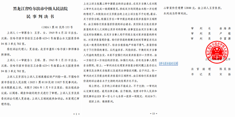 本站讯 2026年2月3日,王芳接到黑龙江省哈尔滨市中级法院作出的(2026)黑01民终155号终审判决,这一纸判决,再次让她陷入了长久的郁闷之中。她说,离婚时协议约定的是房产按份共有,...