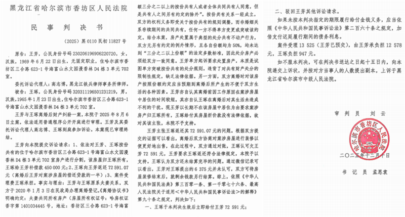 目前,王芳已向黑龙江省高级法院提交再审申请书,提出三项核心请求:依法撤销香坊区法院(2025)黑0110民初11827号民事判决第二项及诉讼费相关判决,撤销哈尔滨市中级法院(2026)黑01民终155号判决,依法将该案发回重审或直接改判。同时,王芳还请求再审法院按照《民法典》规定,以实物分割、折价分割或变价分割的方式,对案涉按份共有房产作出分割裁判,并由王琢承担本案一、二审的诉讼费用。
