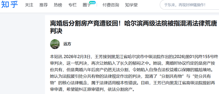 离婚后分割房产竟遭驳回!哈尔滨两级法院被指混淆法律荒唐判决