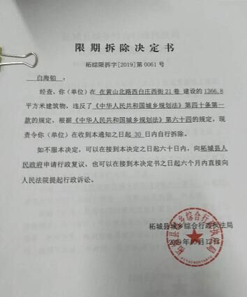 我信访后,柘城县城乡综合行政执法局不得不于2019年10月12日作出柘综限拆字(2019)第0061号限期拆除决定书,该限期拆除时间早已超期,但至今仍未拆除。