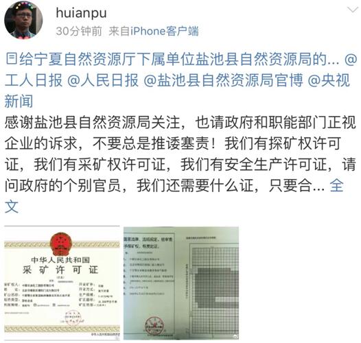 年前宁夏惠安油田工人微博求助后,宁夏自然资源厅下属单位盐池自然资源局陆续给了官方回复,但回复遭到了石油工人的逐一反驳,并贴上了采矿许可证,以示其合法,并再次向各大...