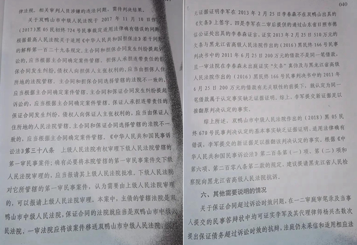 此后(孙伟强夫妇已经骗李春森在二次借款欠条上签字了) 山东省日照市德信公证处出具的公证书 李春森的公正笔录 李春森的公正笔录 李春森的公正笔录 2016年8月25日,经过最高人民法院再审,认为黑龙江省高级人民法院在“有新证据”的情况下应当再审,然而主审法官故意不采信客观证据,而采信伪证,篡改案件基本事实,竟然认定李军承担涉案债务,驳回李军再审申请,致使李军蒙冤受屈。(当事人李军的律师事务所委托黑龙江新讼司法鉴定中心鉴定借条笔迹,结果显示借条笔迹非李军本人,而黑龙江高法采信无效的笔迹鉴定结果,借款人李春森在德信公证处所做证言也未被黑龙江高法采信).