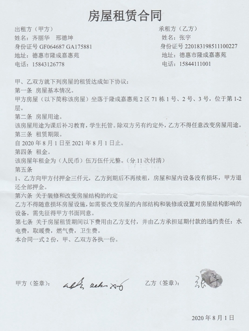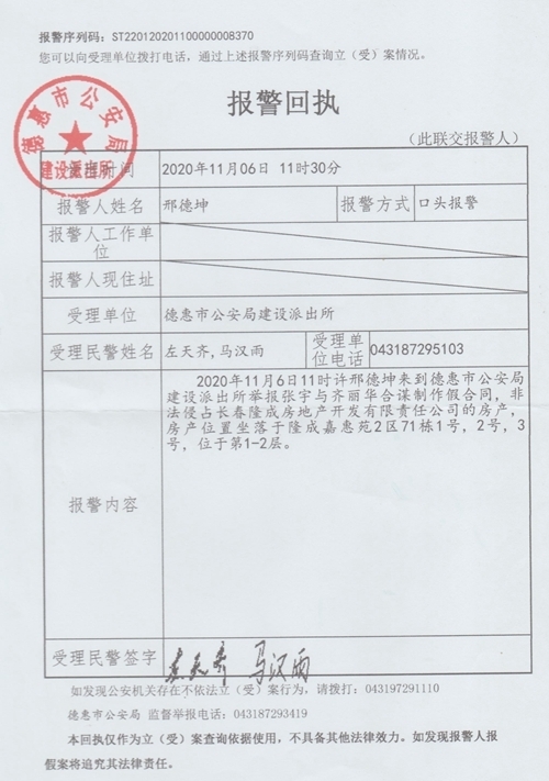 其实这份出入境记录,明眼人一看就知道是假的,至少是个不完全的记录。其实被告齐丽华就在国内,不少人见过她,而且被告还把我公司的房产冒名私自租赁给商户,就此原告已向公安机关报案(附派出所报案回执),并且被告还在2020年分3次亲自到德惠租户那里收取租金(附租房合同与租户付款说明)。各种证据证明被告就在国内,而孙国彬制造的假出入境记录,纯属与被告勾结所作的伪证,目的是为拖延该离婚案的重审找借口。作为一名法官,公开做违法、有损于执法人员的涉嫌犯罪的事,是法律所不容的。孙国彬不仅不能秉公执法,而且还为被告制造假证据,弄虚作假,欺骗法庭、欺骗上级、玩弄原告,这就是犯罪。孙国彬还有何资格做法官工作,在这种人的面前还谈什么法律与良心呀!就是这样一个弄虚作假的伪君子所提供的假证明,致使于茗辉院长至今还在拖延该离婚案的审理。朝阳区法院上、下勾结,竭尽全力寻找各种借口,企图拖延时间,阻止该离婚案重审。由此可见,朝阳区法院相当一批人腐败到了何种地步?真是让人瞠目结舌。