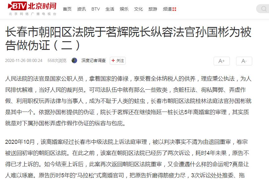 人民法院的法官是国家公职人员,拿着国家的俸禄,享受着全体纳税人的供养,理应秉公执法,为人民排忧解难,当好人民的裁判员。可司法队伍中就有那么一些败类,贪赃枉法、徇私舞弊、弄虚作假、利用职权玩弄法律与当事人,成为不耻于人类的蛀虫,长春市朝阳区法院桂林法庭法官孙国彬就是其中一个。依据孙国彬提供的伪证,院长于茗辉还在继续拖延一桩长达5年离婚案的审理,其实质就是对下属孙国彬弄虚作假作伪证的纵容与包庇。