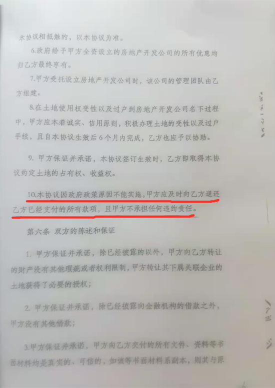 该《合作协议书》第三条第十款之规定:本协议因政府政策原因不能实施,甲方应及时向乙方退还乙方已经支付的所有款项,且甲方不承担任何违约责任。