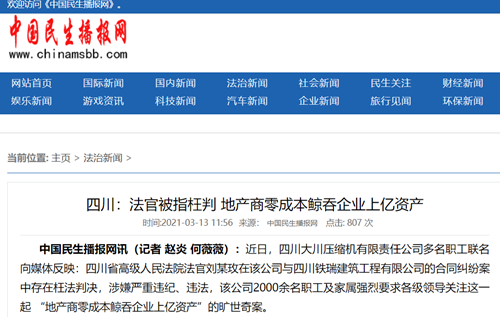中国民生播报网讯(记者 赵炎 何薇薇):近日,四川大川压缩机有限责任公司多名职工联名向媒体反映:四川省高级人民法院法官刘某玫在该公司与四川铁瑞建筑工程有限公司的合同纠纷案中存在枉法判决,涉嫌严重违纪、违法,该公司2000余名职工及家属强烈要求各级领导关注这一起 “地产商零成本鲸吞企业上亿资产”的旷世奇案。