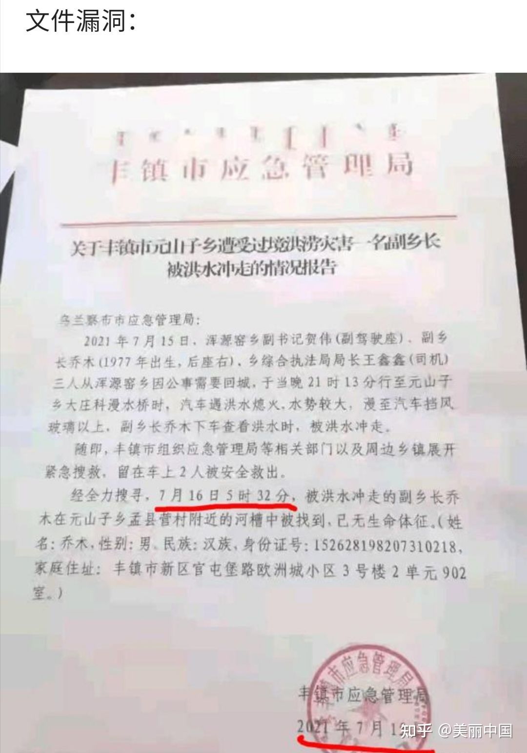具体文件通报日期与找到死者的时间不吻合,(15日发生事故,16日找到死者,而通报日期显示为15号,)文件里明确指出,“经全力搜救7月16日5时32分在元山子乡孟县营村附近找到了该乡长(乔某),已无生命体征”。