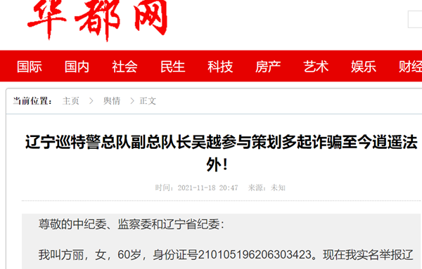 我叫方丽,女,60岁,身份证号210105196206303423。现在我实名举报辽宁省公安厅巡特警总队副总队长吴越组织策划多起诈骗活动的犯罪事实。
