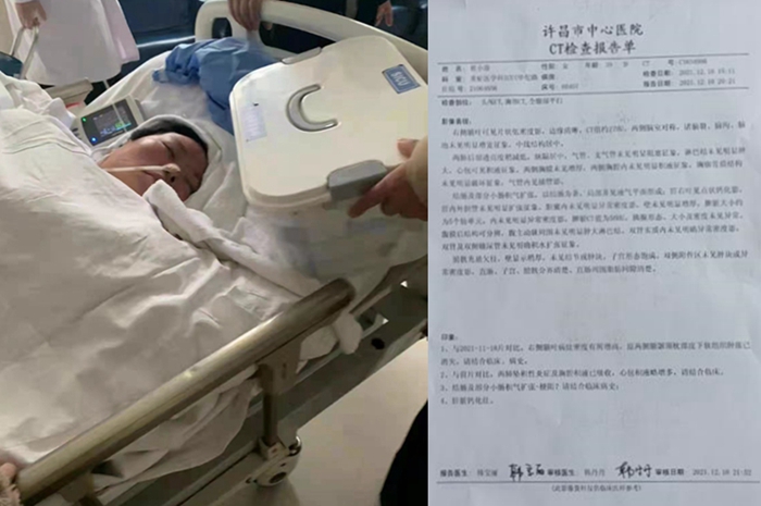 2021年11月17日早上7:42分,我妻子崔小珍入院许昌医院妇产科准备做剖宫产手术,当日下午15:时左右被推进手术室进行手术,没想到的是此次进入手术室后我妻子至今没再醒过来。大约过了一个多小时,16时左右,医生告诉我,说我妻子“心跳停止、没有呼吸约4分钟左右,需马上转院”。大约17时,许昌市中心医院救护车把我妻子从许昌医院接走转诊。
