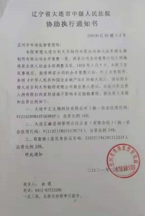 2021年2月3日,大连中院作出(2019)辽02破3-2号协助执行通知书,称“百利公司和禾甜公司合并重整一案,重整计划将原出资人权益调整为零。2020年5月9日,本院下发民事裁定,批准两家公司的合并重整计划”,要求庄河市市场监督管理局协助将百利公司的出资人变更为大连中汇生物科技有限公司(以下简称“中汇公司”)、大连汇融咨询管理合伙企业(有限合伙)(以下简称“汇融咨询”)和荀**,并称“此前对原出资人持有股权的查封措施不影响本次协助事项”。