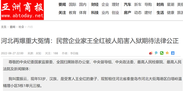 2020年11月,我通过新闻媒体,把我丈夫王全红遭人陷害含冤入狱的事件进行了报道,标题为《民营企业真的是唐僧肉?河北草根发明家王全红案引发巨大争议!》,可是仍然没有引起社会关注,也没有引起地方政府司法机关对此案件的重视。