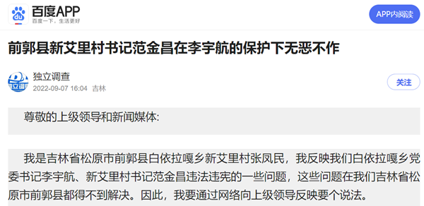 9、2022 年4 月份,吉林市、长春市疫情严重的时候,上级叫下边排查外出在外地和来往人员时,康家于长凤在长春回家到松原,被县、市疫情指挥部查到时才知道新艾里村瞒报此事。而范金昌的亲信石磊在外地回家进行隔离时,根本没有隔离,没有监管监控,石磊随处去外地莲花泡去买鱼吃,还自己向新立本屯自发了一个驾车视频,得意洋洋,新立网群有150多人都知道,还传到我的手机网上,我反映后,县、省上级找乡,乡不承认,再追究没人管了,我举报到省长热线也不了了知。