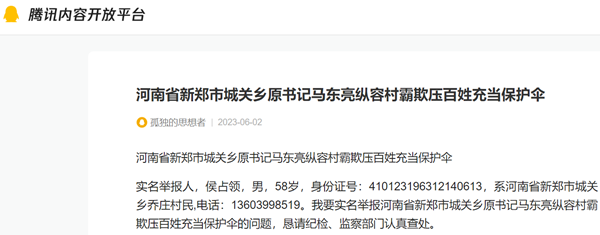 实名举报人,侯占领,男,58岁,身份证号:410123196312140613,系河南省新郑市城关乡乔庄村民,电话:13603998519。我要实名举报河南省新郑市城关乡原书记马东亮纵容村霸欺压百姓充当保护伞的问题,恳请纪检、监察部门认真查处。